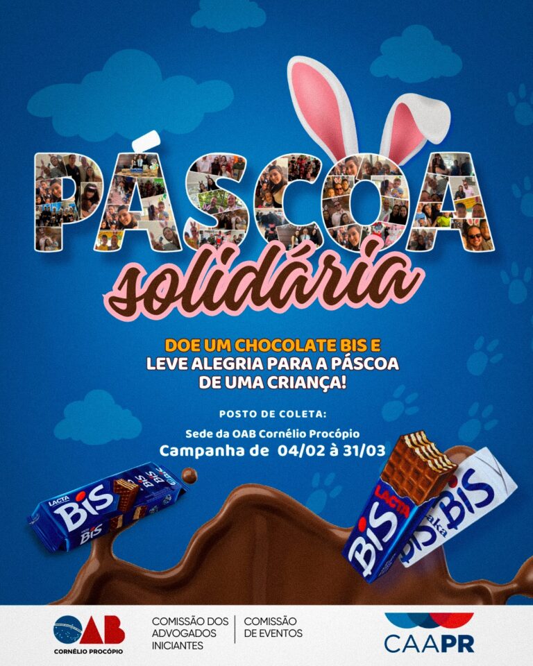 A OAB CORNÉLIO PROCÓPIO, está promovendo mais um ano a Campanha Páscoa Solidária, com o objetivo de levar alegria e carinho para as crianças em situação de vulnerabilidade. Estamos arrecadando chocolates para instituições de acolhimento e comunidades carentes, oferecendo um momento doce e afetuoso nesta Páscoa.
