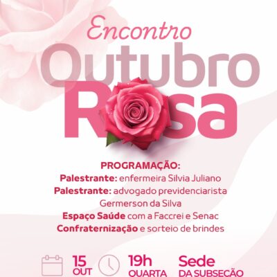 Temos um convite muito especial para você! 💗No próximo dia 15, às 19h, aqui na nossa subseção, realizaremos o Encontro Outubro Rosa, com uma programação repleta de cuidado, informação e acolhimento. ✨ Programação: Palestras com a enfermeira Sílvia Juliano e o advogado previdenciarista Germerson da Silva; Espaço Saúde, em parceria...