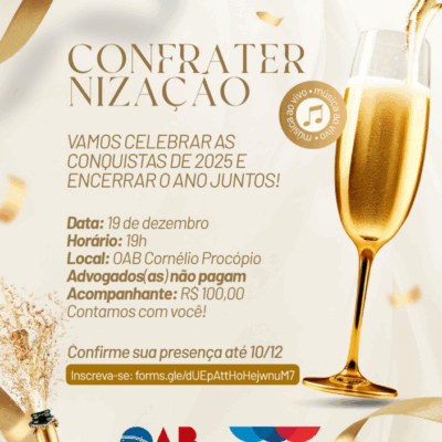 O ano tá acabando e a hora de celebrar chegou!A Confraternização da Advocacia já tem data marcada e você não vai ficar de fora, né? 👀🎉 📅 19 de dezembro⏰ 19h📍 Sede da OAB ✅ Advogados(as) não pagam👥 Acompanhante: R$ 100,00🧒 Crianças até 10 anos: free! (mas precisa informar no...