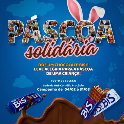 🍫💖 Campanha Páscoa Solidária - OAB CORNÉLIO PROCÓPIO 💖🍫 A OAB CORNÉLIO PROCÓPIO, está promovendo mais um ano a Campanha Páscoa Solidária, com o objetivo de levar alegria e carinho para as crianças em situação de vulnerabilidade. Estamos arrecadando chocolates para instituições de acolhimento e comunidades carentes, oferecendo um momento...